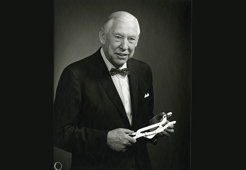 Prior to his retirement, Joe Sunnen posed for this portrait holding his first invention, an adjustable valve lifter hand tool for working on flathead automobile engines.